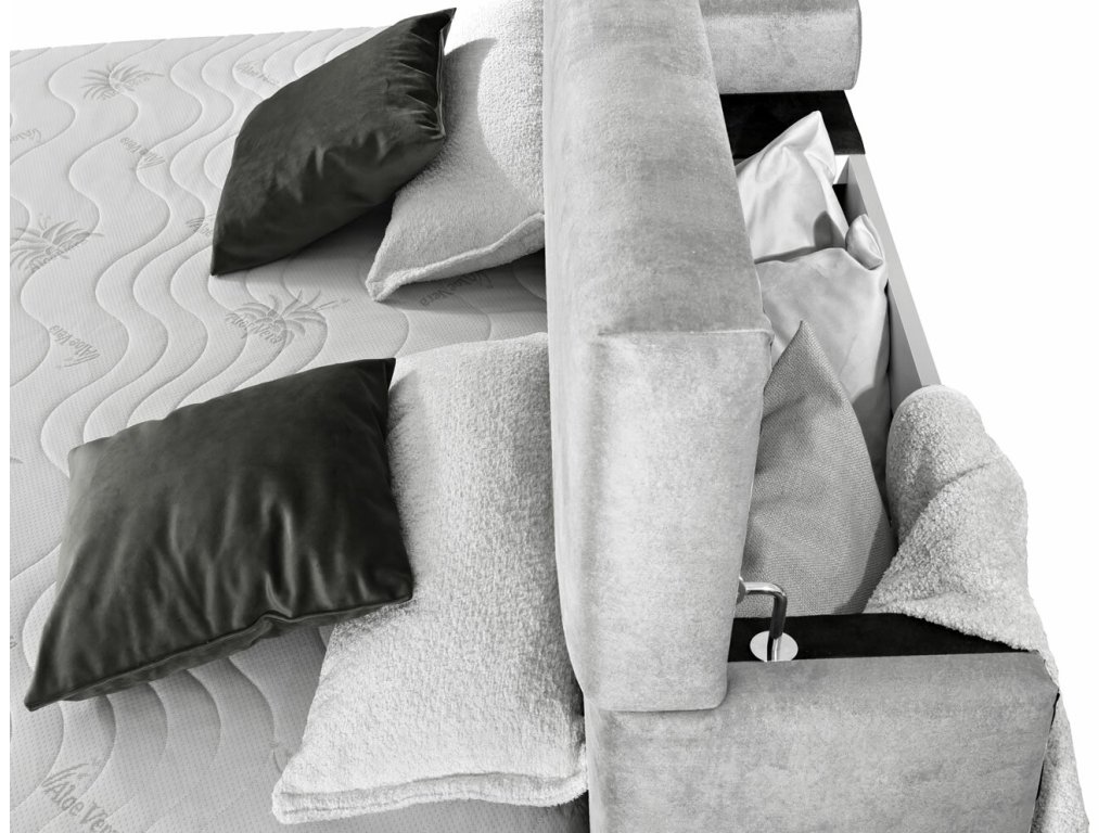 Na korpusu postele leží lamelový dřevěný rám obsahující vzdušné pružinové jádro, vrstvu pěny a dutého vlákna a vše je začalouněnou pevnou textilií.