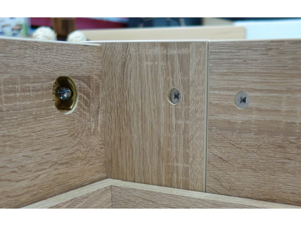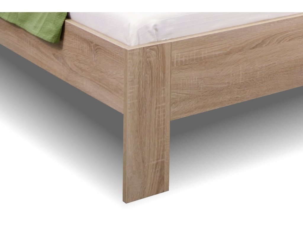 Rám postele Maria je vyroben z odolných laminovaných desek o tloušťce 2,5 cm, což zajišťuje dostatečnou pevnost a odolnost. Je k dispozici v několika odstínech dřeva, včetně oblíbených dezénů jako dub sonoma, dub zlatý, bíla nebo ořech. Na prezentaci je postel vyobrazena v odstínu Dub sonoma.